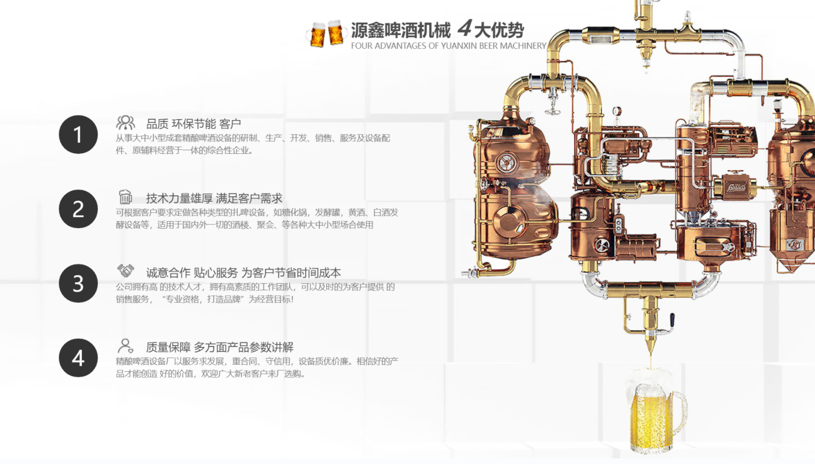南陽(yáng)市源鑫啤酒機(jī)械設(shè)備有限公司位于歷史文化名城一-南陽(yáng),從事大中小型成套啤酒、白酒自釀設(shè)備的研制、生產(chǎn)、開發(fā)、銷售、服務(wù)及設(shè)備配件、原輔料經(jīng)營(yíng)于一體的綜合性企業(yè)。公司可根據(jù)客戶要求定做各種類型的扎啤設(shè)備,如糖化鍋,發(fā)酵罐,黃酒、白酒發(fā)酵設(shè)備等,適用于國(guó)內(nèi)外一切的酒樓、餐廳、家庭.聚會(huì)、酒吧等各種大、中、小型場(chǎng)合使用。公司擁有技術(shù)人才,擁有高素質(zhì)的工作團(tuán)隊(duì),可以及時(shí)的為客戶提供**的銷售服務(wù)。公司以“專業(yè)資格,打造品牌”為經(jīng)營(yíng)目標(biāo),“卓越質(zhì)量,信賴價(jià)格”為經(jīng)營(yíng)宗旨,以質(zhì)量求生存,以服務(wù)求發(fā)展,重合同、守信用,設(shè)備質(zhì)優(yōu)價(jià)廉。相信好的產(chǎn)品才能創(chuàng)造 好的價(jià)值,歡迎廣大新老客戶來廠選購(gòu)。...